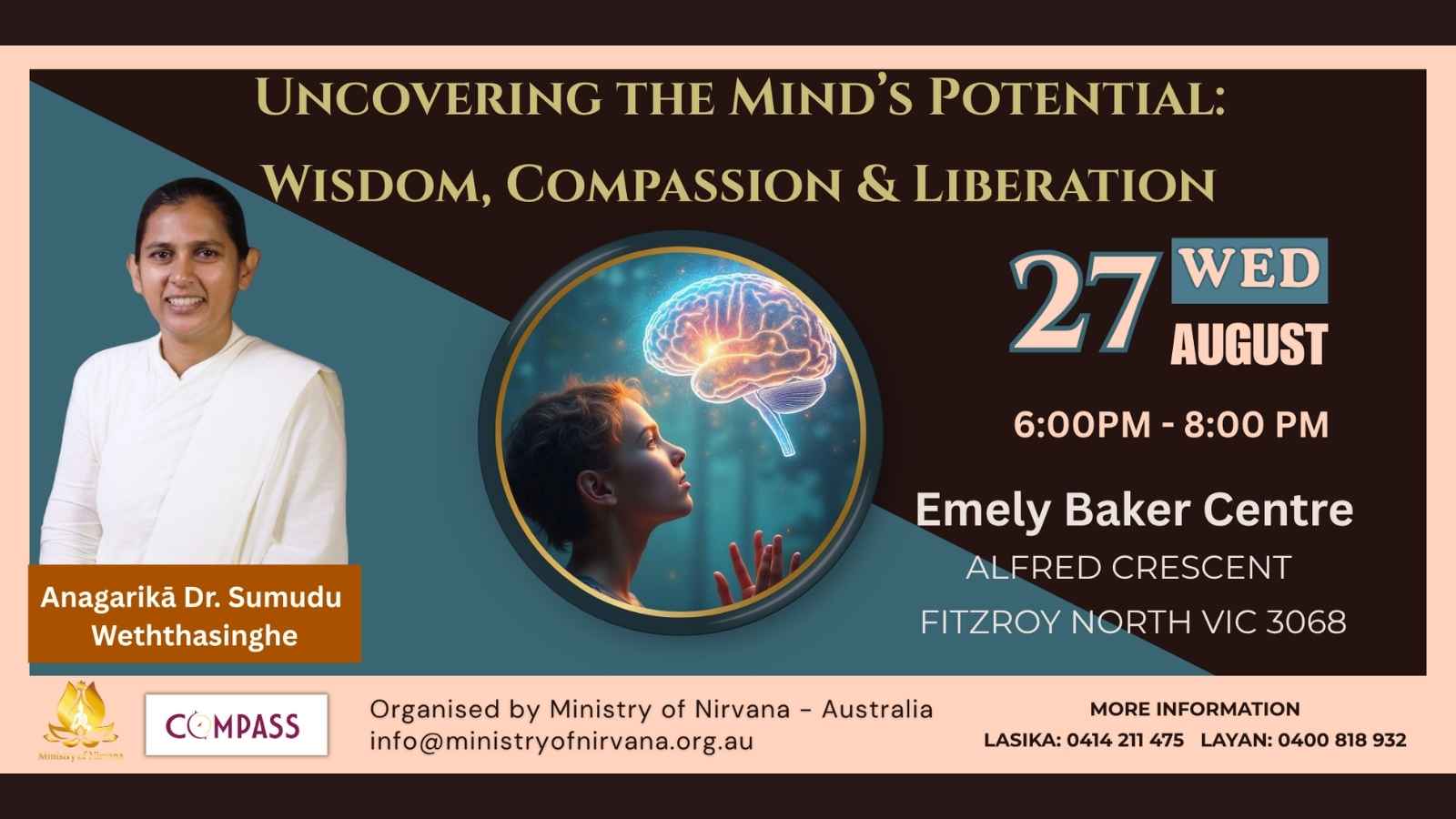 Join Anagārikā Dr. Sumudu Weththeasinghe for an evening of deep insight and practical reflection as we explore the untapped potential of the human mind through time-tested inner practices and contemplative understanding. In this special session, you will gain a clearer understanding of how wisdom arises through awareness, how compassion naturally flows from clarity, and how inner freedom is possible—here and now. You’ll also be invited to reflect on how personal transformation can positively impact the world around us, creating lasting peace and purpose.
